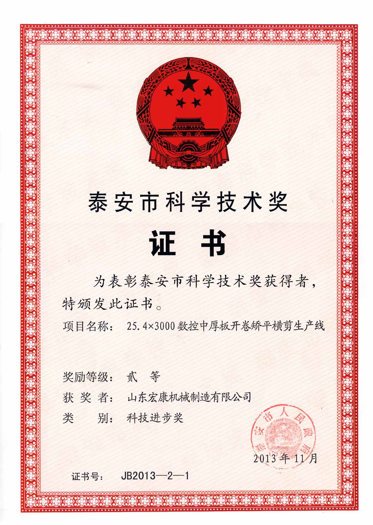 5月7日下午,全市科學(xué)技術(shù)獎勵大會召開。會議對2013年度泰安市科學(xué)技術(shù)最高獎、泰安市科技進步獎獲得者、泰安市科技創(chuàng)新工作先進縣市區(qū)進行表彰。集團公司完成的25.4×3000數(shù)控中厚板開卷矯平橫剪生產(chǎn)線榮獲泰安市科技進步二等獎。這是集團公司在科技研發(fā)中取得的又一殊榮,也是本年度獎勵大會中受到表彰的機械行業(yè)為數(shù)不多的獎項。