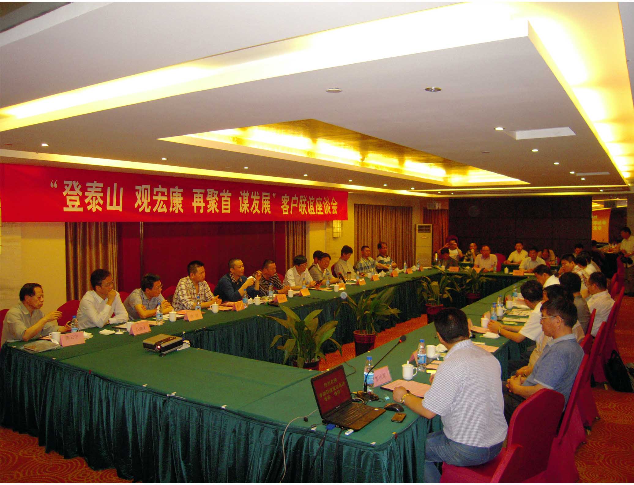 巍巍泰山展畫(huà)卷,喜迎賓朋八方來(lái)。5月23日至25日,集團(tuán)公司在東尊華美達(dá)酒店隆重舉辦“登泰山 觀宏康 再聚首 謀發(fā)展”客戶聯(lián)誼座談會(huì)。來(lái)自國(guó)內(nèi)外的20余家重點(diǎn)客戶企業(yè)領(lǐng)導(dǎo)及科研院所的專(zhuān)家領(lǐng)導(dǎo)們?cè)俅蜗嗑厶┥侥_下,登臨泰山之巔,暢敘友誼,共謀合作發(fā)展。集團(tuán)公司董事長(zhǎng)、總經(jīng)理康鳳明,常務(wù)副總經(jīng)理潘憲平、副總經(jīng)理朱洪軍、副總經(jīng)理朱洪臣等領(lǐng)導(dǎo)出席聯(lián)誼會(huì)議。
