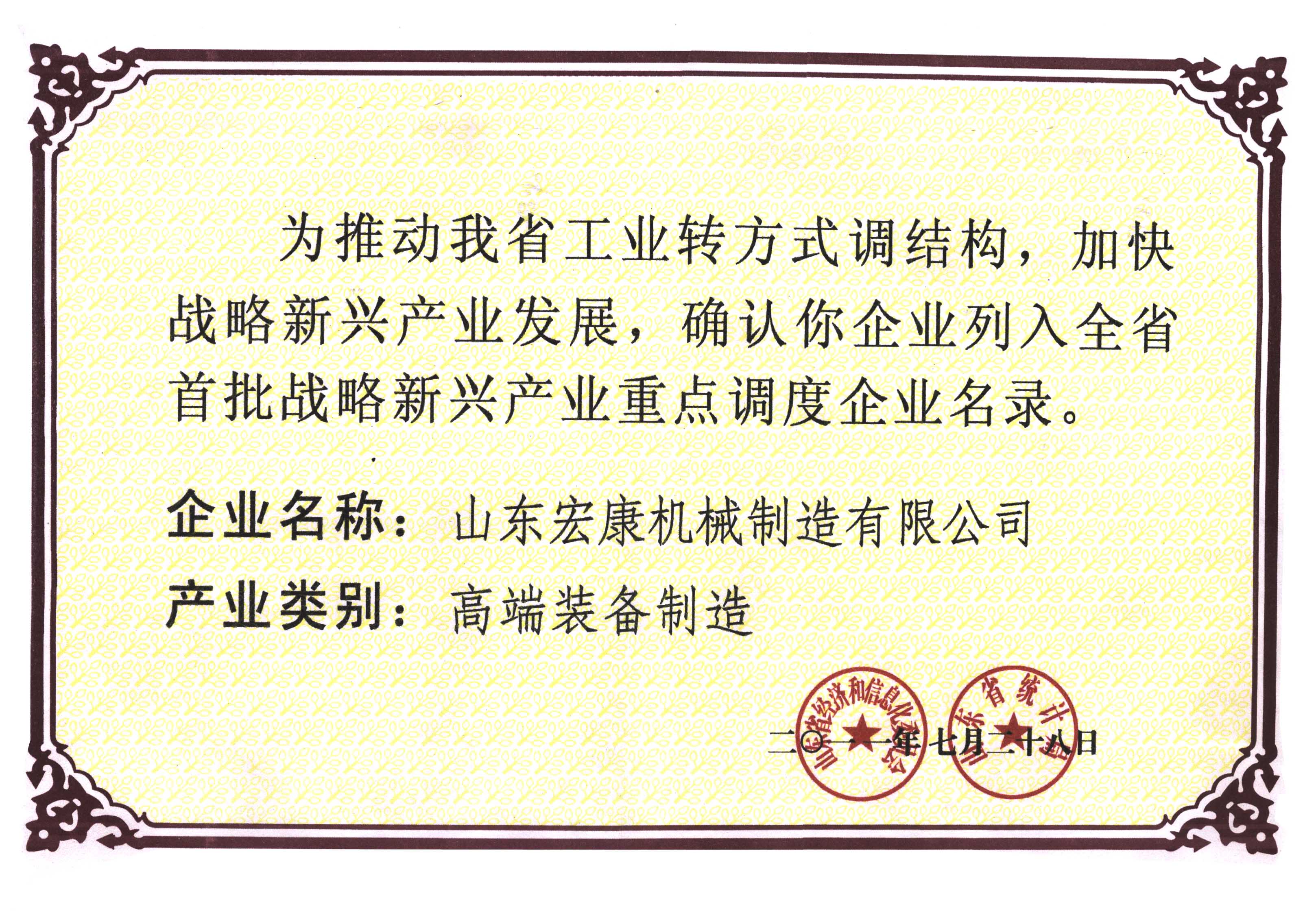 為認真貫徹落實省委、省政府關(guān)于“十二五”期間加快發(fā)展戰(zhàn)略新興產(chǎn)業(yè)的重大決策部署,充分發(fā)揮戰(zhàn)略新興產(chǎn)業(yè)重點企業(yè)的引領和帶動作用,推動我省工業(yè)轉(zhuǎn)方式、調(diào)結(jié)構(gòu),提高經(jīng)濟運行質(zhì)量和效益。經(jīng)公司申報,泰安市經(jīng)信委和統(tǒng)計局審核推薦,省經(jīng)信委、省統(tǒng)計局聯(lián)合審核認定了全省254家首批戰(zhàn)略新興產(chǎn)業(yè)重點調(diào)度企業(yè),其中高端裝備制造企業(yè)33家,我公司名列其中。