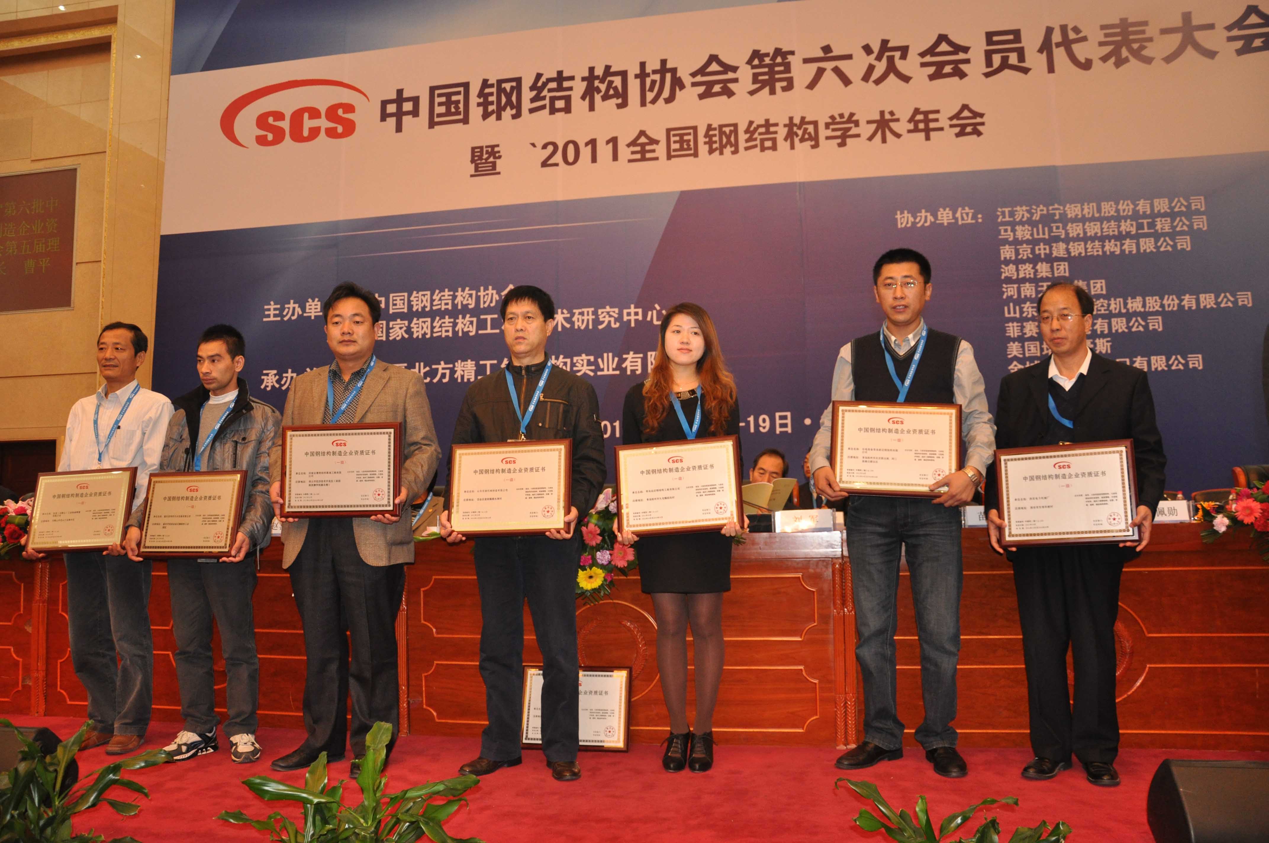 在大會(huì)上,公司董事長、總經(jīng)理康鳳明當(dāng)選為中國鋼結(jié)構(gòu)協(xié)會(huì)第六屆理事會(huì)理事。同時(shí),中國鋼結(jié)構(gòu)協(xié)會(huì)向獲得第六批中國鋼結(jié)構(gòu)制造企業(yè)資質(zhì)的單位頒發(fā)了資質(zhì)證書和牌匾。常務(wù)副總經(jīng)理潘憲平代表公司上臺(tái)領(lǐng)取了中國鋼結(jié)構(gòu)制造企業(yè)一級(jí)資質(zhì)證書及牌匾。