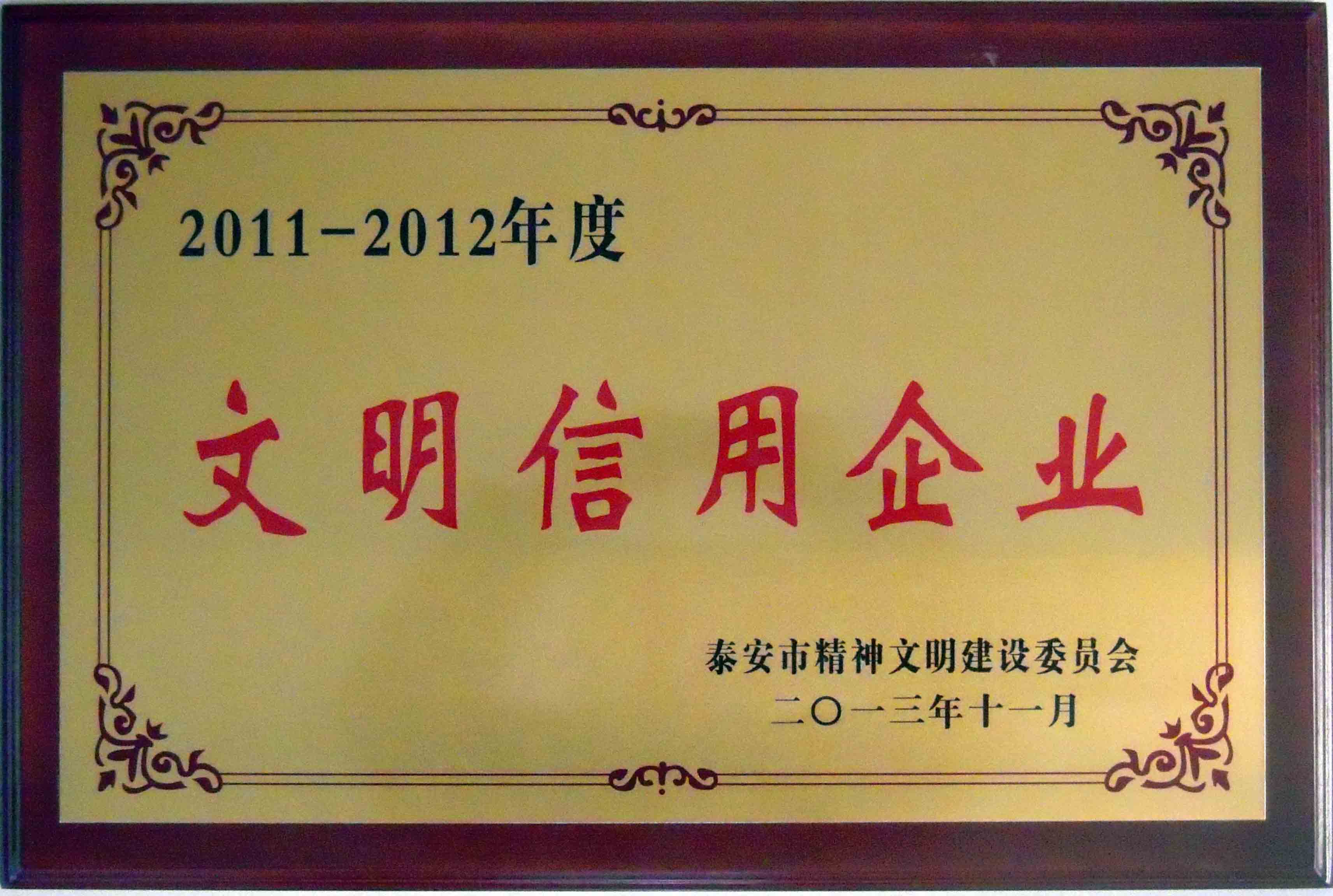 根據(jù)泰安市精神文明委員會下發(fā)《關(guān)于命名2011-2012年度泰安市文明誠信金融單位、文明信用鄉(xiāng)鎮(zhèn)、文明信用企業(yè)的決定》(泰文明委【2013】10號),集團(tuán)公司被授予“泰安市文明信用企業(yè)”稱號。