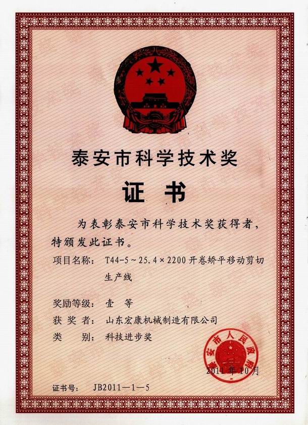 4月6日,全市科學(xué)技術(shù)獎(jiǎng)勵(lì)大會(huì)隆重召開。我集團(tuán)宏康機(jī)械公司“T44-5-25.4x2200開卷矯平移動(dòng)剪切生產(chǎn)線”項(xiàng)目榮獲2011泰安市科技進(jìn)步一等獎(jiǎng),副總經(jīng)理康峰參加會(huì)議并代表集團(tuán)公司上臺(tái)領(lǐng)獎(jiǎng).