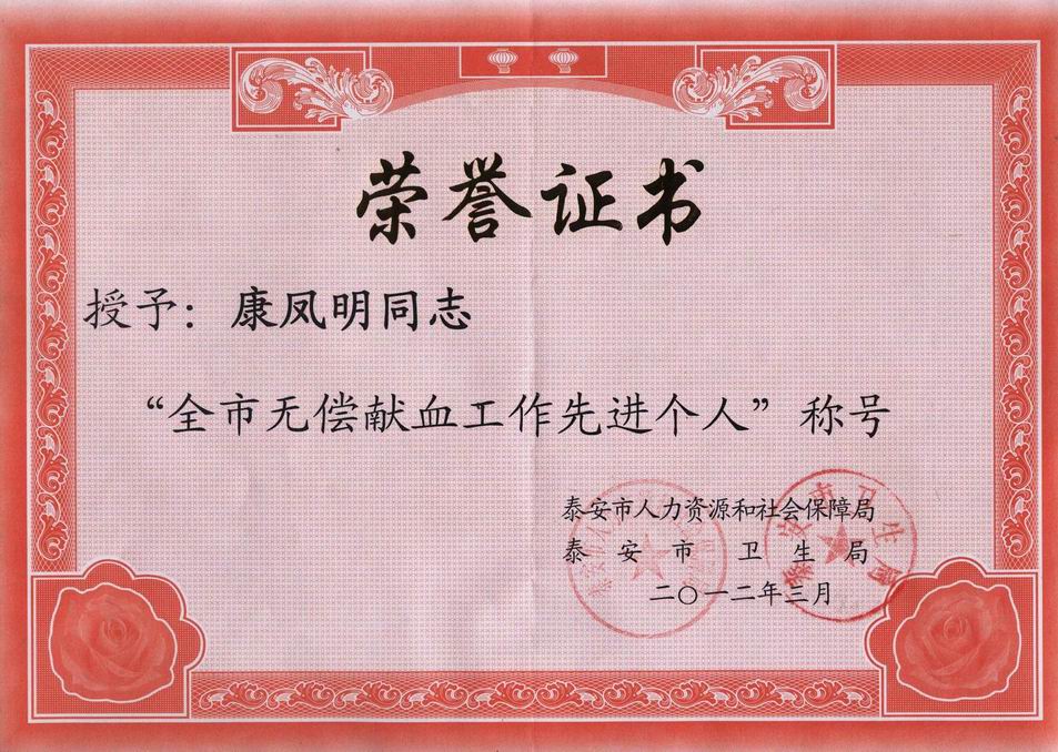 3月22日,泰安市人力資源和社會保障局、泰安市衛(wèi)生局聯(lián)合下發(fā)《關(guān)于表彰全市無償獻(xiàn)血工作先進(jìn)集體、先進(jìn)個人的通報》,集團(tuán)董事長、總經(jīng)理康鳳明被授予“全市無償獻(xiàn)血工作先進(jìn)個人”稱號,并授予榮譽(yù)證書。