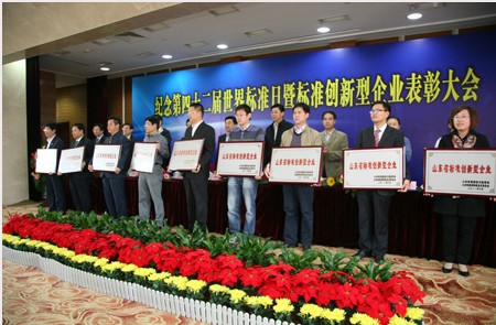 10月14日,山東省質(zhì)量技術(shù)監(jiān)督局、山東省經(jīng)濟(jì)和信息化委員會在濟(jì)南舜耕山莊聯(lián)合舉行紀(jì)念第42屆世界標(biāo)準(zhǔn)日暨全省標(biāo)準(zhǔn)創(chuàng)新型企業(yè)表彰大會,共同慶祝第42屆世界標(biāo)準(zhǔn)日的到來,并對評選出的山東省首屆標(biāo)準(zhǔn)創(chuàng)新型企業(yè)進(jìn)行表彰。受董事長、總經(jīng)理康鳳明委托,集團(tuán)常務(wù)副總經(jīng)理潘憲平參加了此次表彰大會并上臺領(lǐng)取“山東省標(biāo)準(zhǔn)創(chuàng)新型企業(yè)”榮譽牌匾。