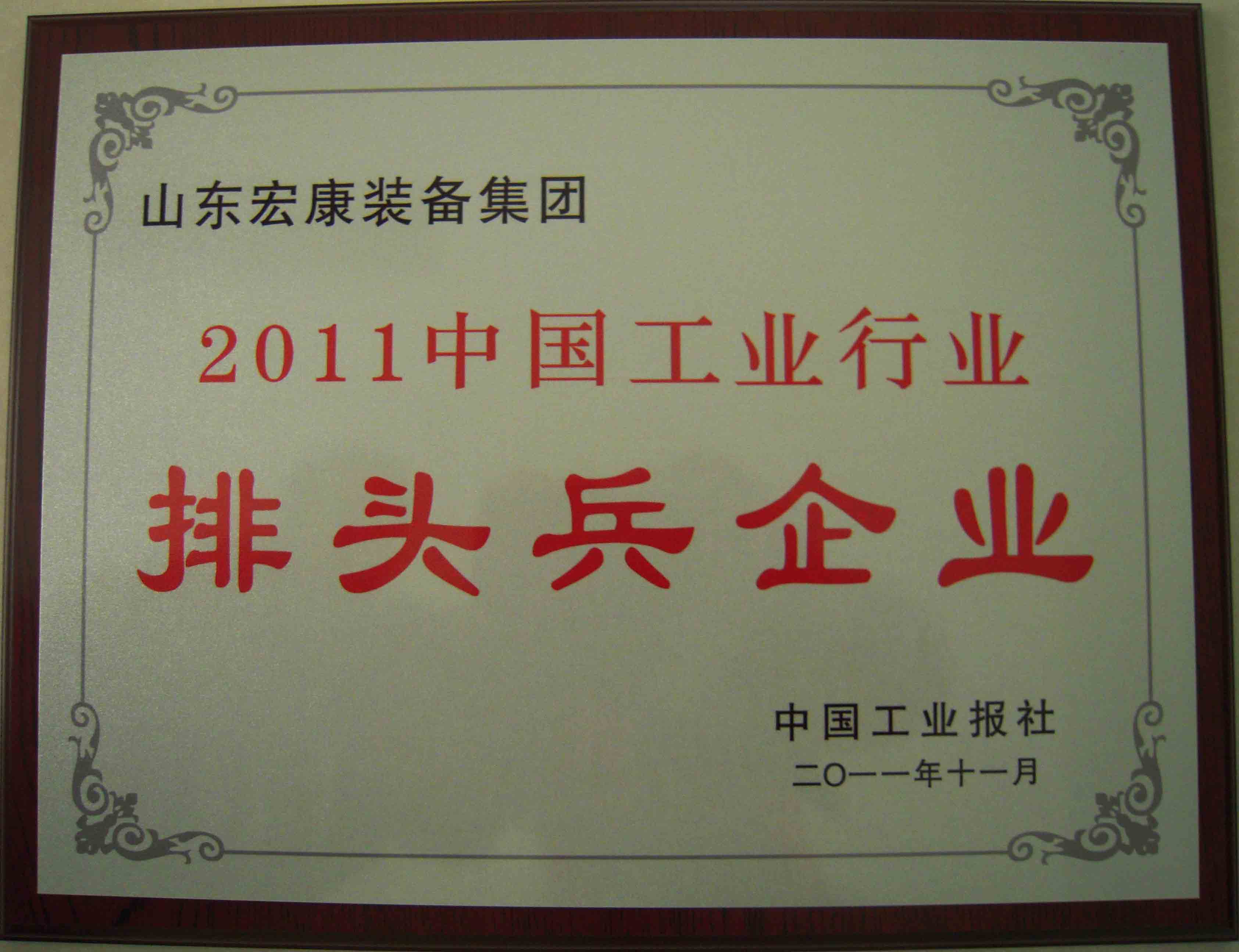 2011年11月8日,“2011中國工業(yè)行業(yè)排頭兵企業(yè)名單”隆重發(fā)布,山東宏康裝備集團成功入選2011年中國金屬成形機床制造行業(yè)排頭兵企業(yè)名單,同時榮獲“科技創(chuàng)新”和“行業(yè)新星”兩個單項獎。